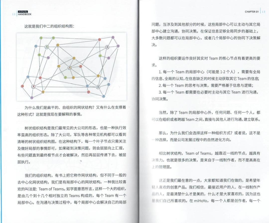 在米哈游早期的员工手册(从口吻来看应该是出自蔡浩宇之手)中,米哈游格外地强调自己扁平的、自组织的网状组织结构,也就是Team of Teams,这种组织方式可以让许多决策来自一线制作者而非管理层。