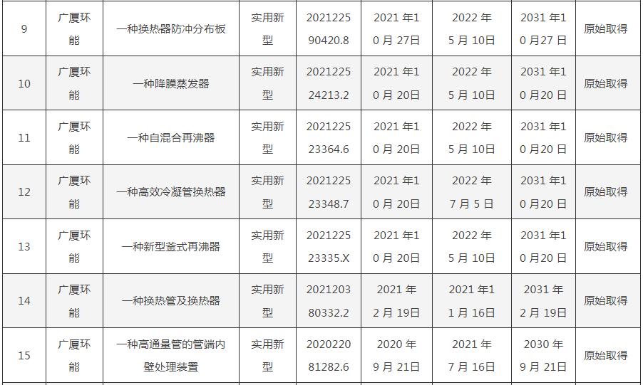 招股书显示,广厦环能目前已被认定为国家级专精特新“小巨人”企业、北京市“专精特新”中小企业,公司在2022年还获得了“河北省第四批省级制造业单项冠军产品”。截至2022年12月31日,已拥有91项专利(9项发明专利和82项实用新型)和5项软件著作权,形成了“多孔表面沸腾强化技术”、“高通量管低温成型技术”、“冷凝强化传热技术”等7项核心技术。