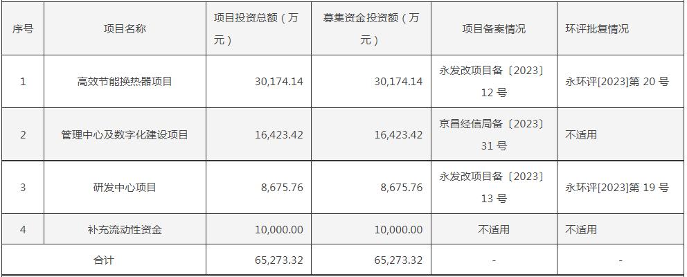本次募集资金拟投入3.02亿元用于高效节能换热器项目建设,1.64亿元用于管理中心及数字化建设项目建设。高效节能换热器项目建设期为2年,建设达产后,可实现新增年产10,000吨高效换热器的生产能力,预计每年可新增销售收入43595.77万元。