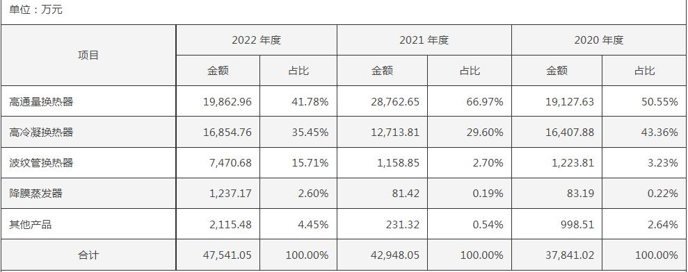 从营收结构来看,高能量换热器占比最高,2020-2022年占比分别达到50.55%、66.97%、41.78%。波纹管换热器和降膜蒸发器营收占比提升速度较快,分别从2020年的3.23%和0.22%上升至2022年的15.71%和2.60%。