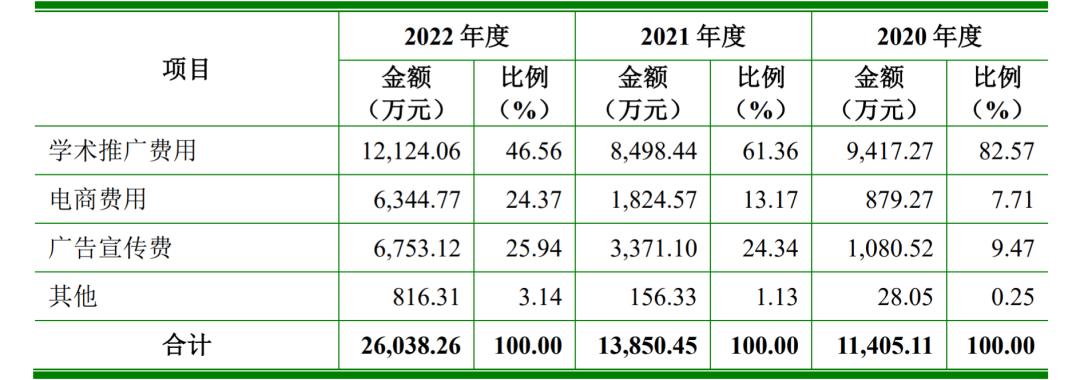 与此同时,随着营收的增长,发行人市场推广费也同步大幅增长,报告期内分别为1.14亿元、1.39亿元和2.60亿元;其中,学术推广费用也快速增长,受到市场的广泛质疑。
