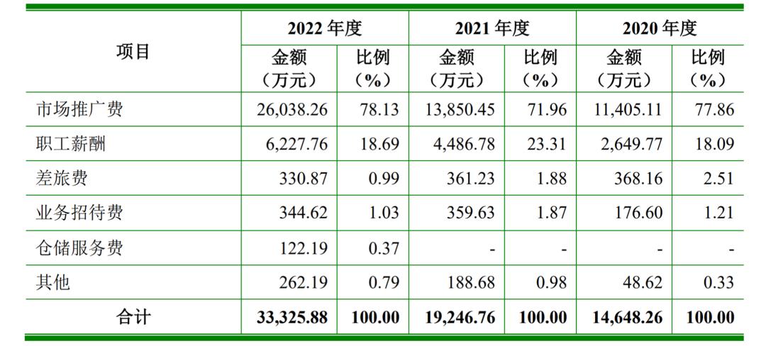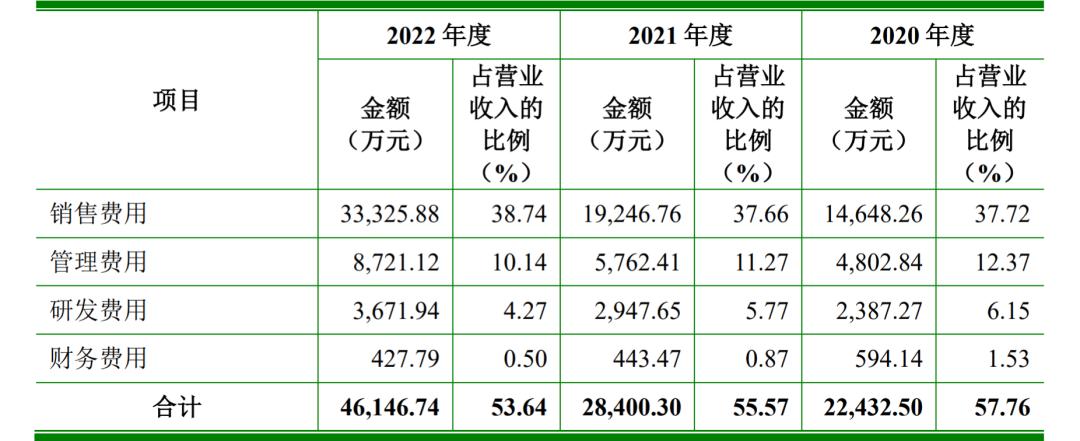 招股书显示,在业绩增长的2020年至2022年,公司的销售费用迅速增长,从2020年的1.46亿元,增加到2021年的1.92亿元,2022年的3.33亿元,占营业收入的占比分别为37.73%,37.66%和38.74%。