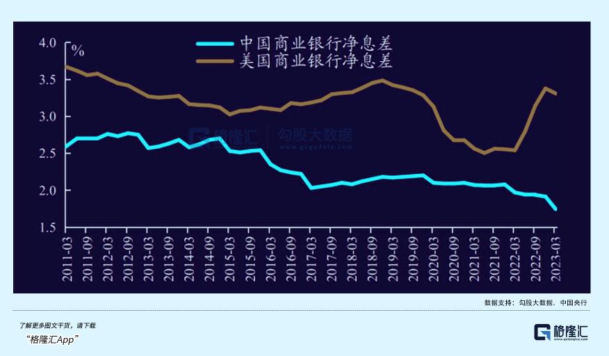 截止今年一季度,商业银行净息差为1.74%,同比再度下降0.23个百分点。而美国商业银行同期净息差为3.31%,是中国的2倍。