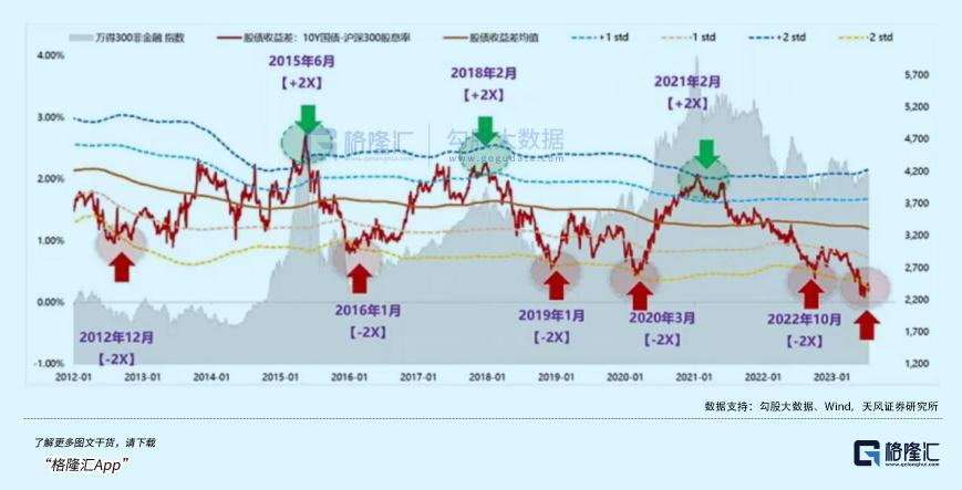 当前,沪深300指数的PE为11.51倍,位于最近5年估值下限区间,跟2020年10月、2020年3月低点水平相差很小了。从另外的角度看,当前沪深300已经来到国债收益均值2倍负标准差的位置了,而此前10年内出现过5次,包括2012年12月、2016年1月、2019年1月、2020年3月、2022年10月。后来,没过多久,市场迎来了绝地反击。