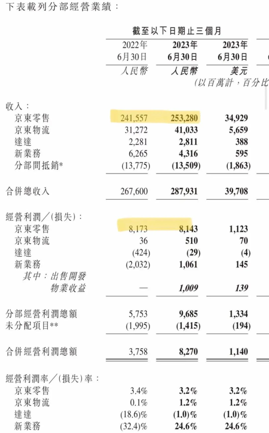 同时,自营零售规模恢复了增长。Q2京东商品收入2338.55亿元,同比增长3.5%,扭转了Q1的负增长态势。不过,价格战显然影响到了自营电商的利润。京东商城板块Q2利润81.4亿,经营利润率3.2%,相比去年同期的3.4%出现下滑。