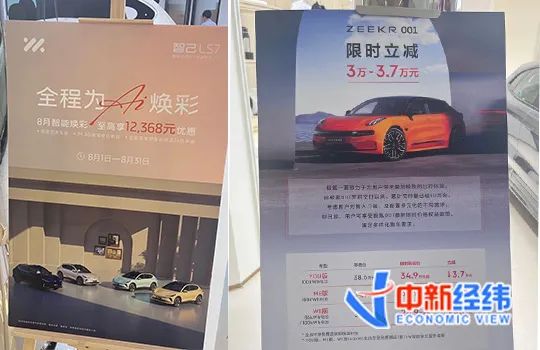 中新经纬走访时发现,几乎所有车企都在门店门口摆放了印有“限时立减”“8月购车礼”等优惠字眼的展板,且价位、优惠力度等关键信息做了标红处理。