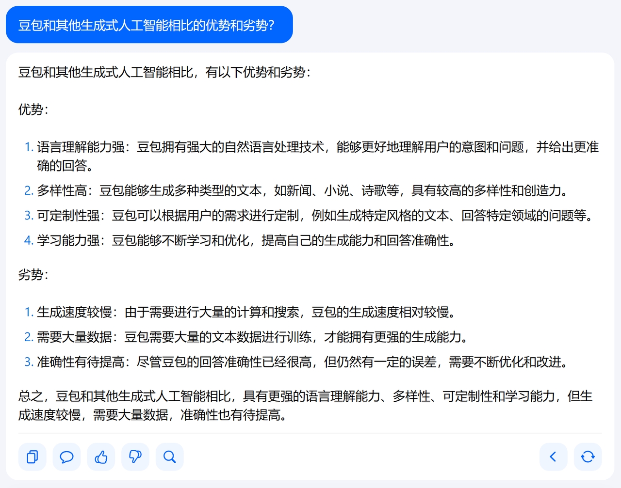 相比之下,豆包在“总结”劣势方面表现得相当诚实——它的准确性确实有待提高。