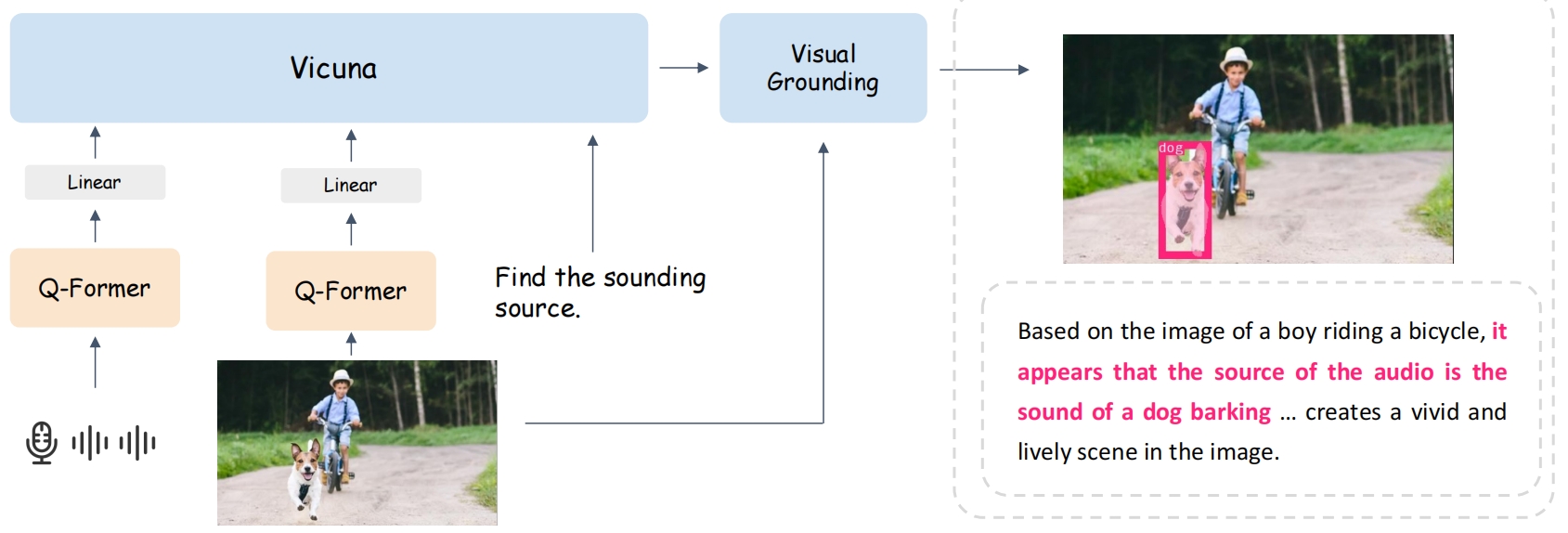 以上图为例,只需要上传一段音频一个图像,BuboGPT就能快速识别音频来自于图像的哪个地方,并且贴心地用边界框帮你框出来!