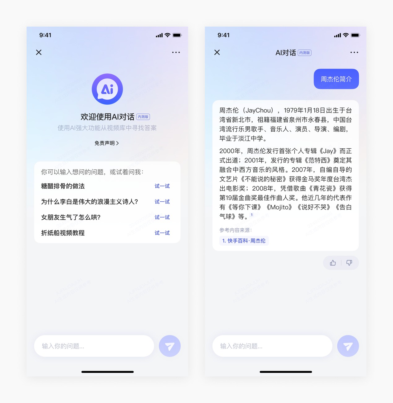 使用方法上,用户只需要点击快手搜索首页右上角的AI图标,直接输入内容或者点击引导问题,就可以开始对话。