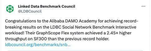 上个月,国际权威图基准测评“LDBC SNB Interactive”(社交网络 - 交互查询)榜单更新中出现关键突破:阿里云开源的图计算引擎 GraphScope 登顶并打破榜单历史纪录,性能达此前纪录保持者 2.45 倍。