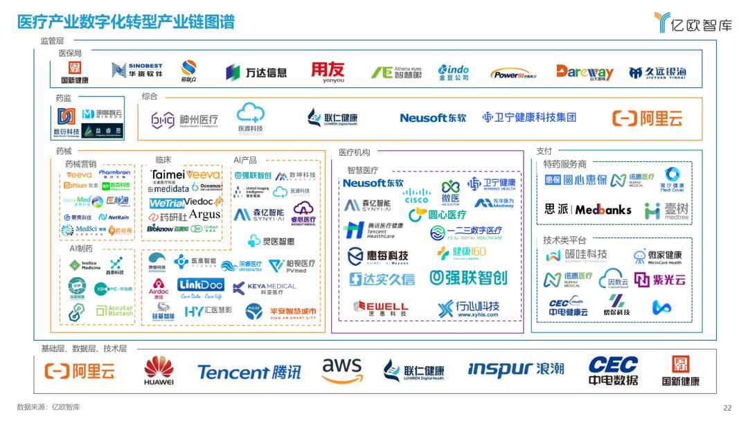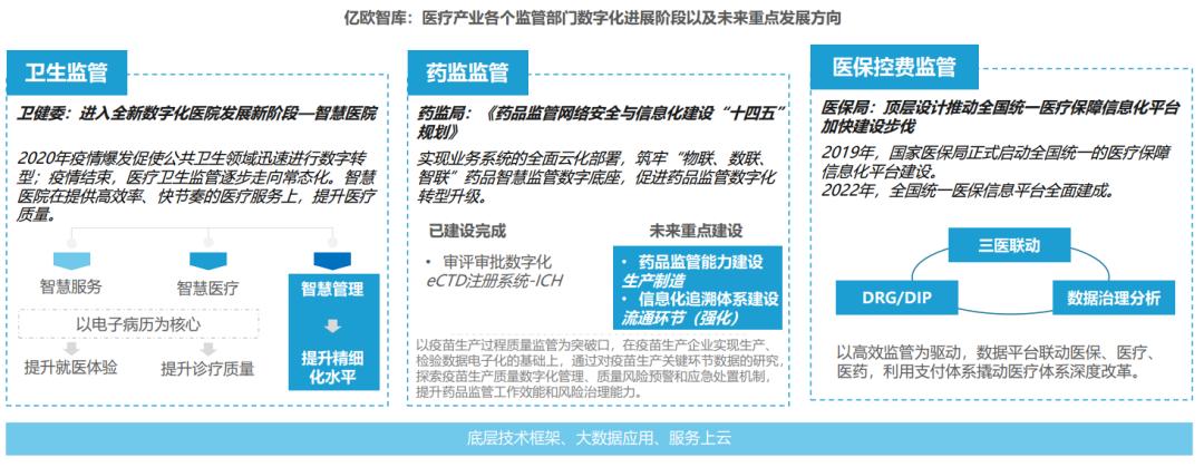 亿欧智库重点研究三大方向的监管数字化转型情况:卫健委、药监局、医保局,每一个细分场景应用,均由政府部门推动实施。为解决监管问题, 其数字化转型动力强劲,相关服务型企业需要根据政府部门要求进行数字化配套建设。具体来看,在卫健委监管层面,也是医疗产业数字化进程时间最长的领域,当前基本完成信息化建设,正在向智慧医院转变。在医保局监管层面,全国统一医疗保障信息化平台于2022年全面建成,其以支付为手段,撬动医疗体系深度改革。在药监局监管层面,随着中国加入ICH,审评审批进入新一发展阶段,信息化和数字化成为监管“必修课”, 此部分监管数字化基本完成;随着药品监管逐步深入,未来将以生产制造和强化流通为目标,进一步完成数字化转型升级。