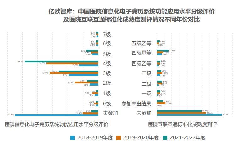 依据CHIMA《2021-2022年度中国医院信息化状况调查报告》中数据显示,本年度调研医院中参与电子病历系统功能应用水平分级的医院逐年增加,且参评等级逐年提高,体现出医院电子病历系统功能的逐渐成熟。在医院互联互通成熟度测评方面,参与该项测评的医院逐年增加。虽然高级评定结果占比逐年提高,但整体互联互通标准化成熟度仍有很大提升空间,到调研年度,仍有近60%的医院尚未参加测评。由此可见,以电子病历为核心的智慧服务正在快速提升,但是需要互联互通为基础的智慧医疗尚未达到预期,深度使用有待进一步提高。