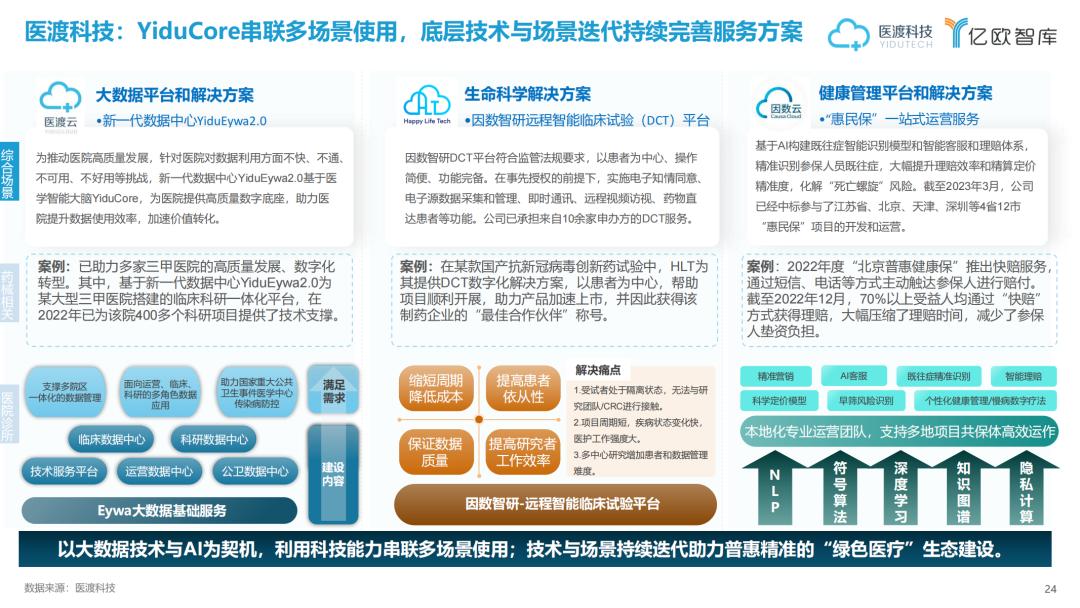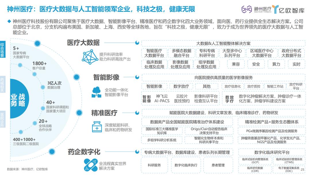 在医疗产业数字化转型中,诞生了利用数字化技术服务整个医疗行业链条的业务模式。其本质是底层资源复用,该类型业务模式底层技术壁垒不高, 更多的是行业理解壁垒及行业资源壁垒,大数据治理及智慧化应用拉开产业差距。因医疗行业本身属性较为沉重,能够串联医疗不同场景的数字化转型的企业,最关键的是能够理解医疗行业运营模式、资源配比,以及具有相关社会医疗资源积累。当前,以综合应用为主的市场玩家,以落地服务产业链为方向,通过大数据治理与AI算法深度应用,提升医疗产业链整体运营效率,节省社会资源。