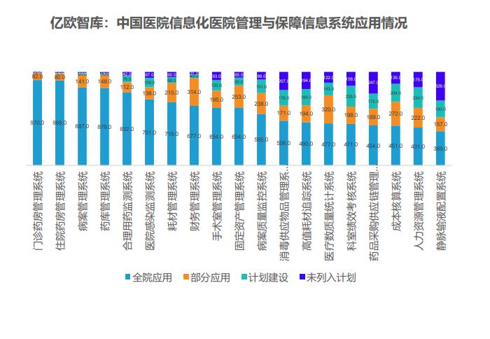 在实际应用中,医院管理层面不同管理功能使用频率和次数均有不同,其中用药管理和监测在全院应用中占比相对较高;医疗数质量统计系统在部分应用的系统中占比最高。整体来看,在智慧管理层面,可提升空间仍然较大。