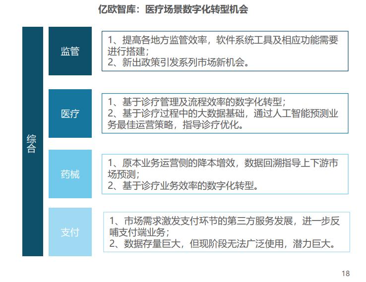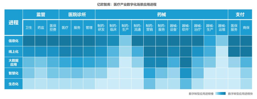 医疗产业是一个庞大的系统,每一细分场景数字化转型进度及应用进程均有所不同,这与细分行业本身特性有极大关系。在本报告中,亿欧智库将按照不同场景,来梳理数字化转型进度和应用情况,对其应用进程进行评估。
