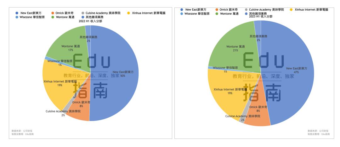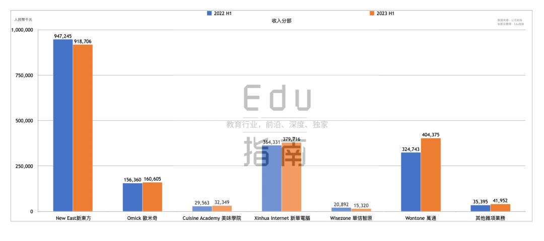 中国东方教育上半年收入主要来自七分部业务,包括新东方烹饪教育、新华电脑教育、万通汽车教育、欧米奇西点西餐教育、华信智(原DT人才培训基地)、美味学院、其他杂项业务(包括时尚美业及向第三方提供的互联技术解决方案与员工外包服务)。