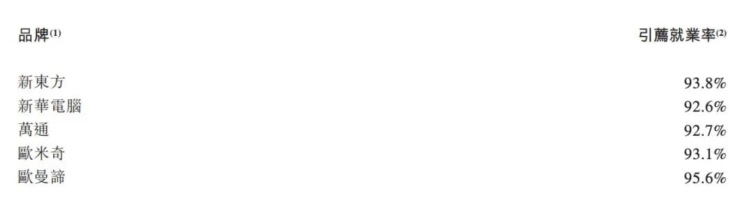 在技能培训就业率方面,该公司在财报称,旗下新东方、新华电脑、万通、欧米奇、欧曼谛等长期毕业生平均就业及创业率达90%。截至2023年6月的六个月,上述品牌长期课程毕业生引荐就业及创业率分别为93.8%、92.6%、92.7%、93.1%、95.6%