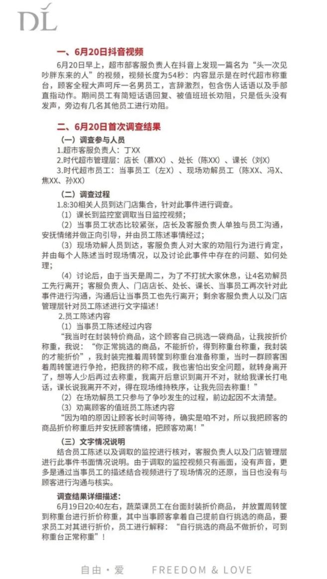 6月底,一位顾客在胖东来与员工发生争执。事后,胖东来发布了一份长达8页WORD文档的调查通告,详细列明了事发后第2天以及第5天的两次调查结果、处理方案,甚至对比了两次调查的偏差、陈明偏差原因,并就此给出处罚。