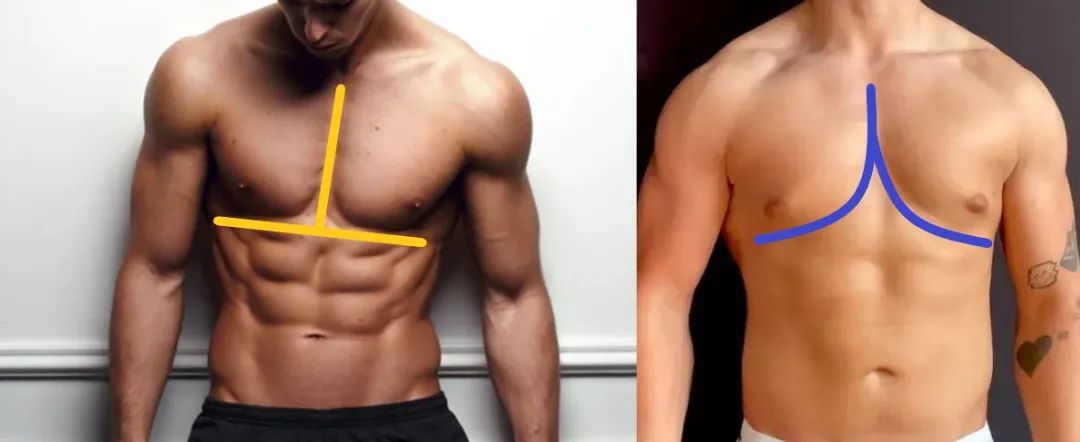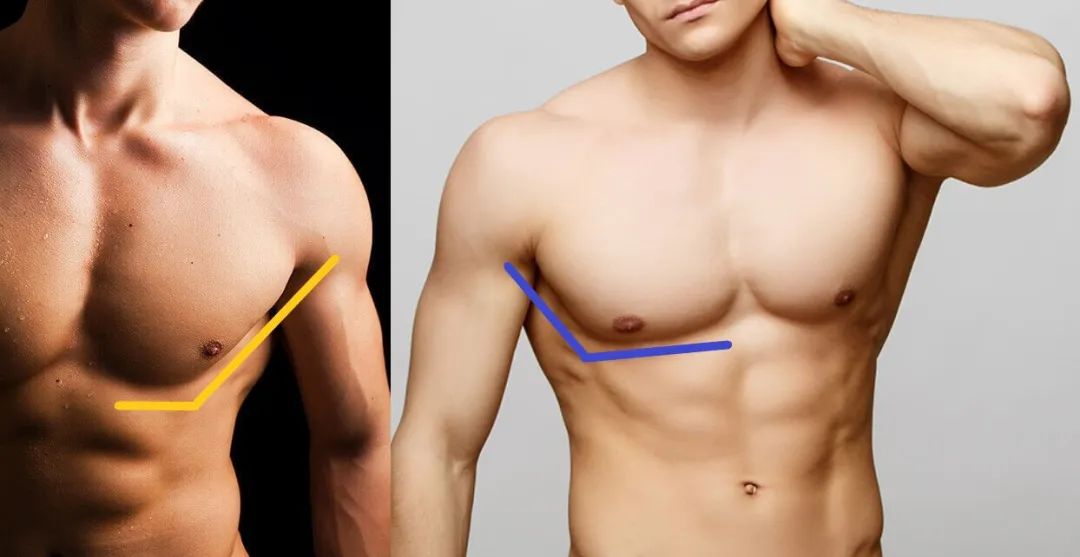 胸大肌形状的方圆,主要由肌肉下缘的线条决定。先来看这条线的内侧,也就是胸大肌的起点,如果两边“扇纸”边缘距离近,中间只留出一条竖线,就显得胸部比较方正;要是“扇纸”下缘逐渐远离,呈“八”字形,看起来就圆一些。