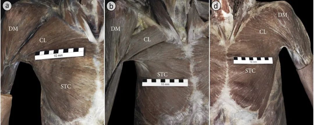 典型的胸大肌如图a,胸前平坦,胸大肌和三角肌之间有比较明显的分界,体脂低、肌肉饱满的时候可以看到胸和肩膀之间有条沟。上面的研究测量了这条沟的宽度,也就是胸大肌锁骨部分与三角肌之间的距离,得到的值从1.03到2.09厘米不等,平均1.62厘米。也有人这两块肌肉之前没有明显界线,顺畅地连接在一起,如图d。