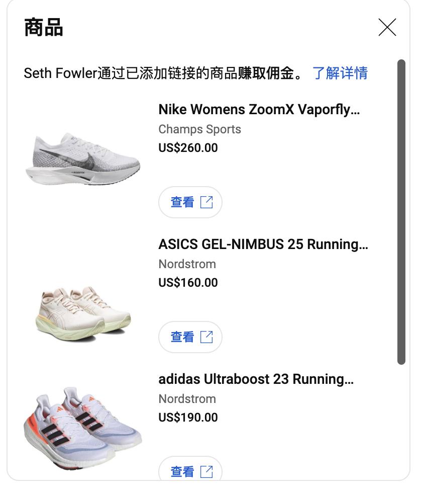 作为YouTube联盟营销计划中的一环,创作者可以查看推广哪些产品能获得佣金,并通过YouTube Studio跟踪销售情况。同时,创作者推广的产品会在视频左下方显示出一个“View products(查看商品)”的标识,观众点击进入后,就可在YouTube站内浏览产品的定价、详情等信息,并跳转到品牌的官网(独立站)完成购买。