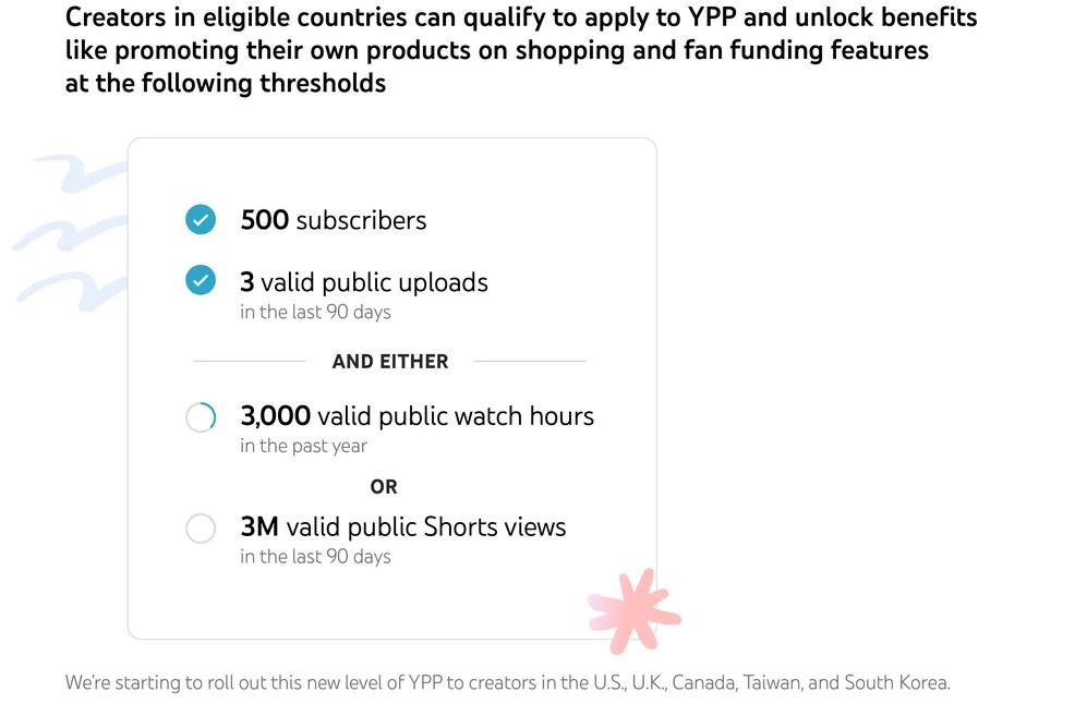 日前,YouTube发布的一份公告显示,将进一步降低“合作伙伴计划”(YouTube Partner Program,简称YPP计划)的准入门槛,对网红的准入要求近乎砍半——由原来的“1000粉丝+最近12个月内视频观看时长累计4000小时(或最近90天内Shorts短视频观看量1000万次)”,变为“500粉丝+最近90天内3次有效上传+过去一年视频观看时长累计3000小时(或最近90天内Shorts短视频观看量300万次)”。