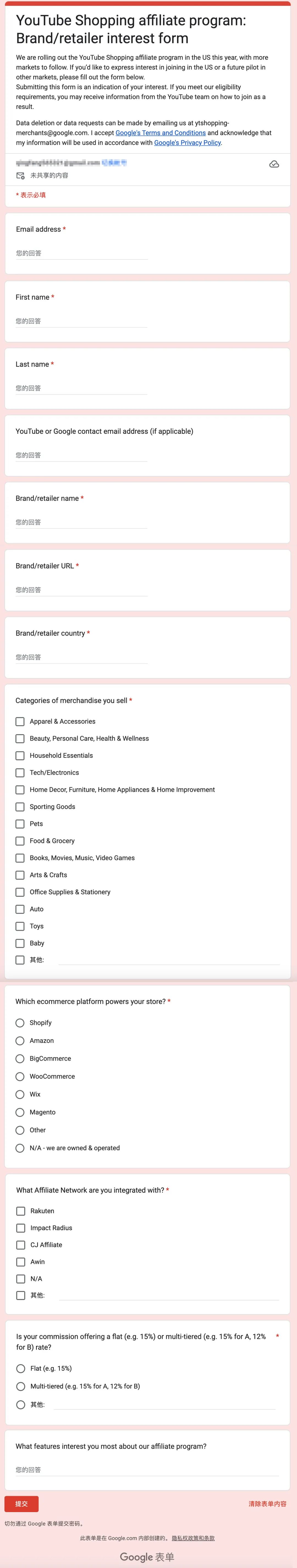 而对于未在上述名单,或是位于尚未开放的地区/市场的商家来说,YouTube也设置有面向他们的调查问卷,品牌/零售商可填写相关信息进行申请。