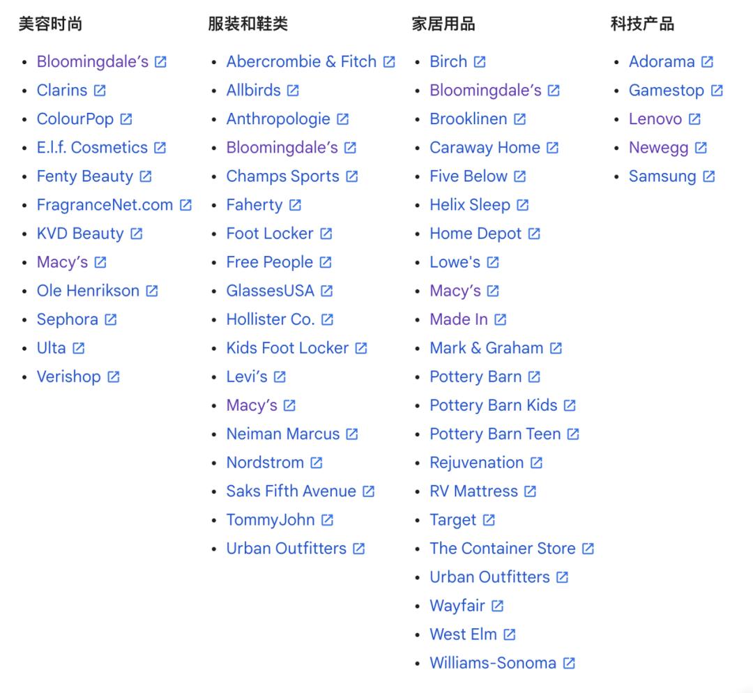 官方公告显示,目前已有50余家品牌入驻YouTube联盟营销平台,品类覆盖Beauty(美容时尚),Apparel&Footwear(服饰鞋类),Home(家居用品),Tech(科技产品)。从现有入驻品牌来看,绝大部分为美国本土企业,其中不乏Target、Lowe's、Macy's、Nordstrom等大型零售商,以及Allbirds、E.l.f Cosmetics等DTC品牌。