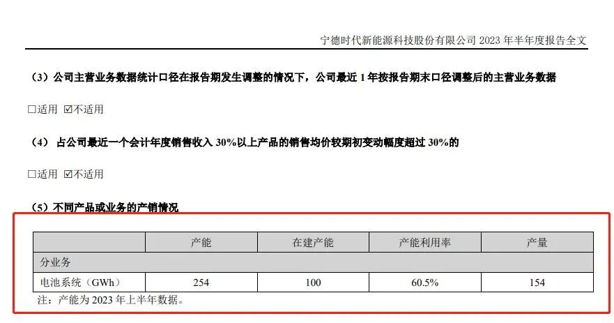产能过剩也反映在工厂的产能利用率上。据宁德时代上半年财报数据,上半年宁德时代总产能为254GWh,产量为154GWh,产能利用率为60.5%。作为对比,2019-2022年,宁德时代电池系统的产能利用率分别为89.17%、74.83%、95%、83.4%。