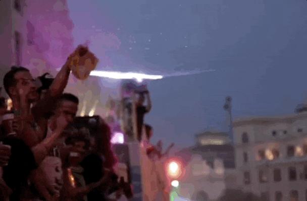 2010年,国外的一位摄影师正在街头拍摄一场庆祝活动,手中的佳能相机刚好被路边的激光灯不断扫射。就在激光扫过第二次的时候,相机所记录的画面上突然出现一条白色的横条纹。