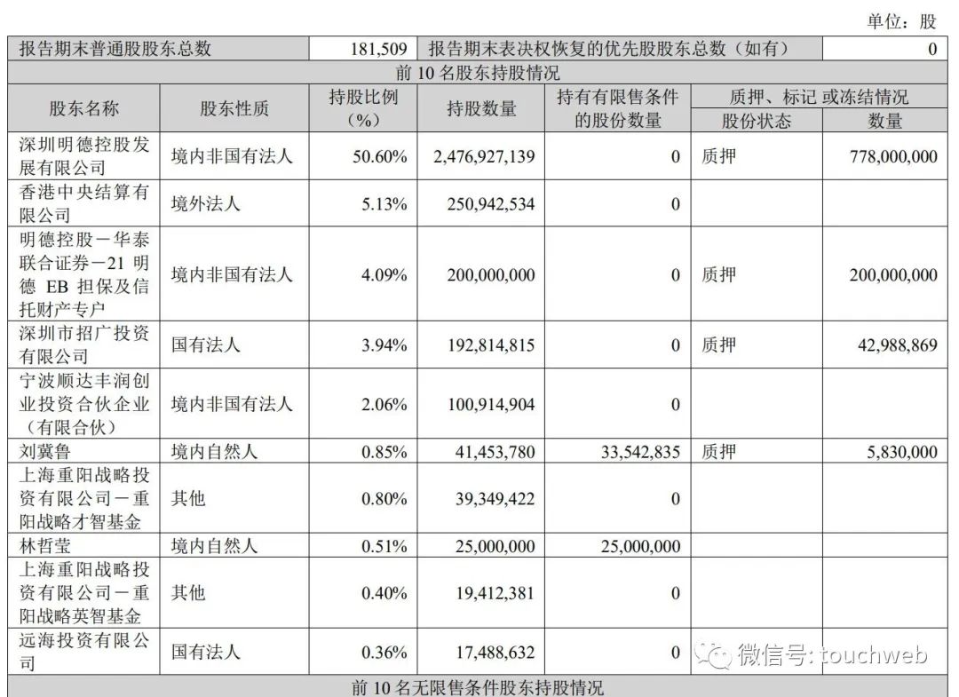 截至2023年3月31日,王卫通过深圳明德控股发展有限公司持股为50.6%,香港中央结算有限公司持股为5.13%,明德控股-华泰联合证券-21明德EB担保及信托财产专户持股为4.09%,深圳市招广投资有限公司持股为3.94%,宁波顺达丰润创业投资合伙企业(有限合伙)持股为2.06%;刘冀鲁持股0.85%;