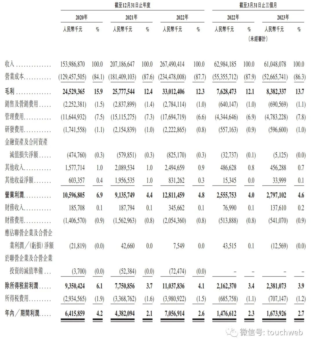 顺丰控股2023年第一季度营收为610.48亿元,上年同期的营收为629.84亿元;经营利润为27.97亿元,上年同期的经营利润为25.56亿元;期内利润为16.74亿元,上年同期的期内利润为14.77亿元。