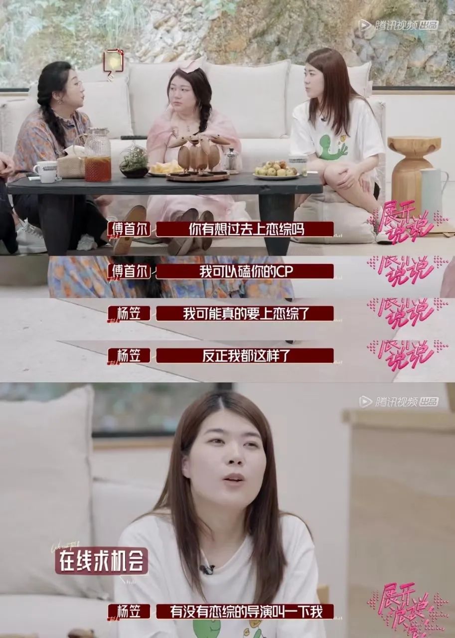 除了职场,还有婚恋,自带喜剧符号,善于在冒犯和试探之间拿捏尺度的脱口秀演员也容易在此类节目中博得好感。李雪琴在《心动的信号第四季》、庞博在《半熟恋人第二季》、杨笠在《同一屋檐下》、何广智在《没谈过恋爱的我》中都有此功能。节目效果好,输出金句多,易与嘉宾快速形成良好的沟通氛围,有一定收视黏性的脱口秀演员们亦可升级为主持,比如李雪琴就和毛不易在《毛雪汪》一边采访嘉宾,一边老友互动唠嗑,杨笠在《展开说说》中与杨天真、易立竞、傅首尔担任主持访问嘉宾。
