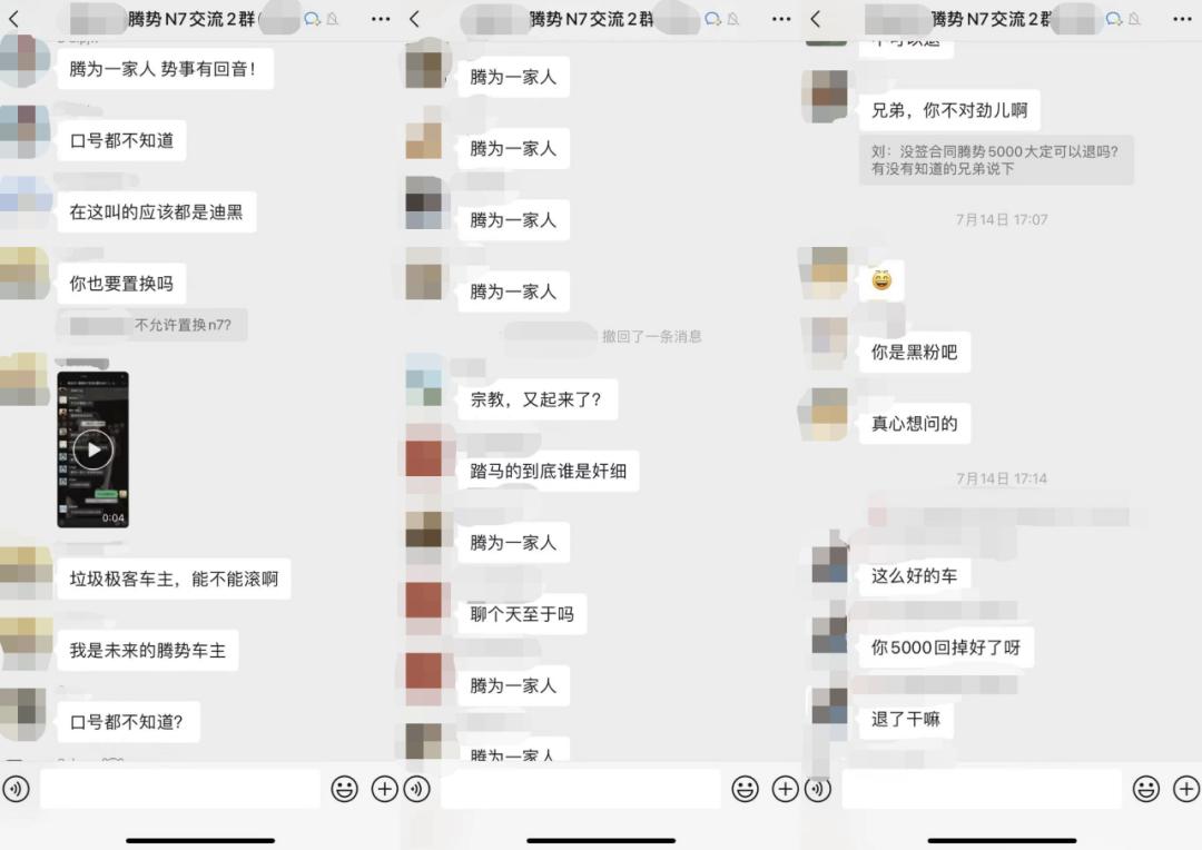 他们在车主群里整齐划一地刷屏,表达对品牌的青睐——“腾为一家人,势事有回音!”“如果一辈子只能有一辆车,我希望它是腾势N7。”并且,粉丝不允许群里有不利于腾势的声音。一位准车主仅仅是在群里表示,在腾势N7和蔚来ES6之间有些纠结,询问定金能不能退,没想到竟迅速引发众车主群起而攻,“你是黑子吧?”“这么好的车,退了干嘛?”