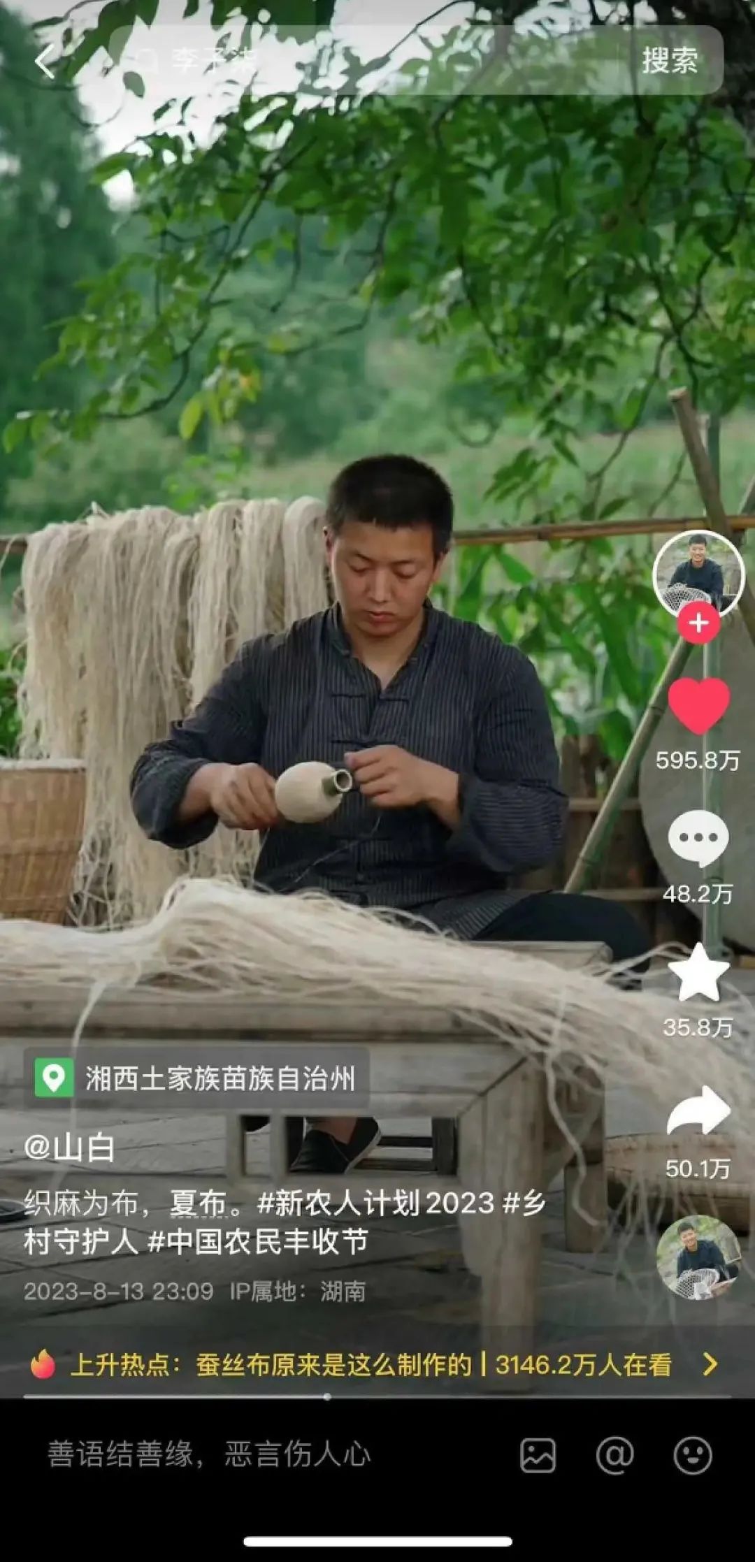 青山绿水,编麻为衣,这条视频在抖音获得了 595.8 万的点赞,抖音账号 @山白 ,靠这一条视频就涨粉了 100 多万。