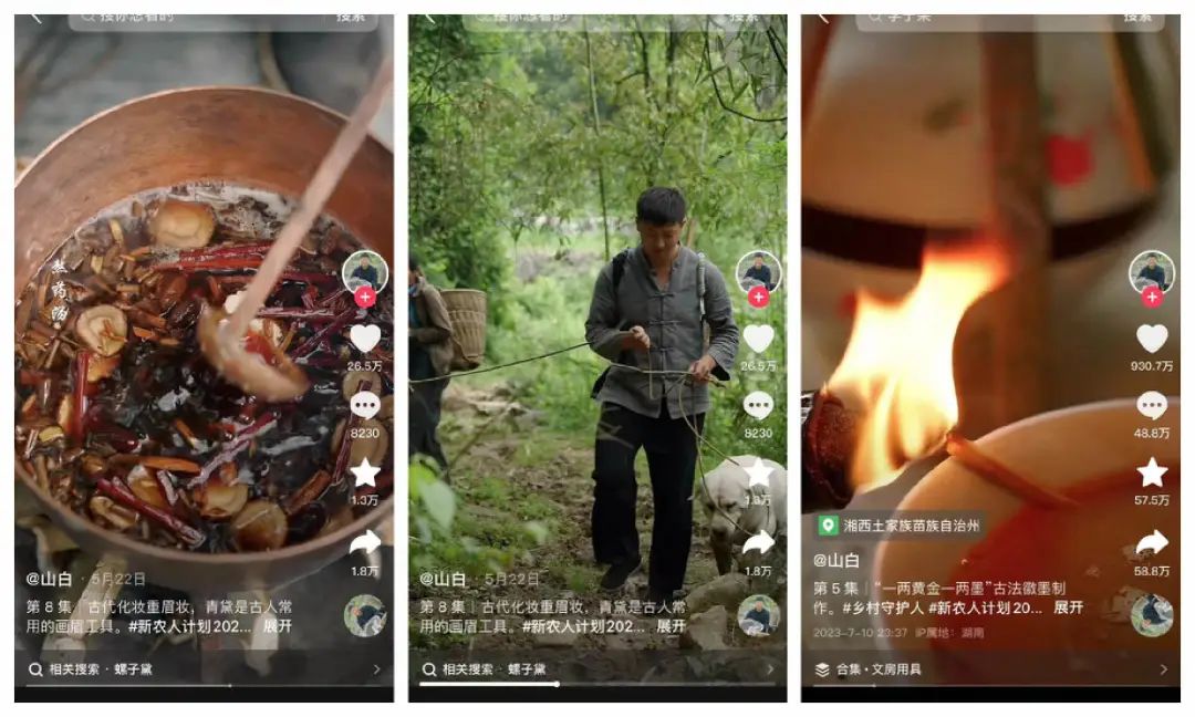其实,如 @山白 一样靠着“田园 + 工艺”快速涨粉的还大有人在,例如南翔、朱铁雄、彭传明、彭南科、李意纯,都靠着相近的内容,成为了火爆一时的博主。
