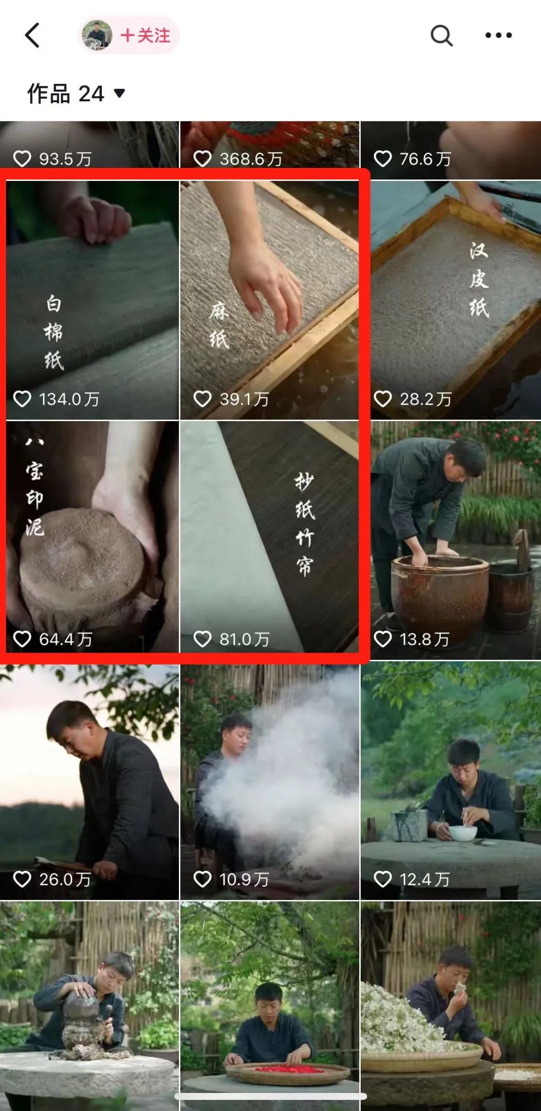 对于一个新账号来说,在没出爆款之前,都是一个“蓄力期”,在这个期间通过稳定的内容输出,吸引核心粉丝很关键。 @山白 在出爆款前,一共发了 17 个视频,数据最好的是改换封面之后,有一条 81.6 万点赞的《抄纸竹帘》。