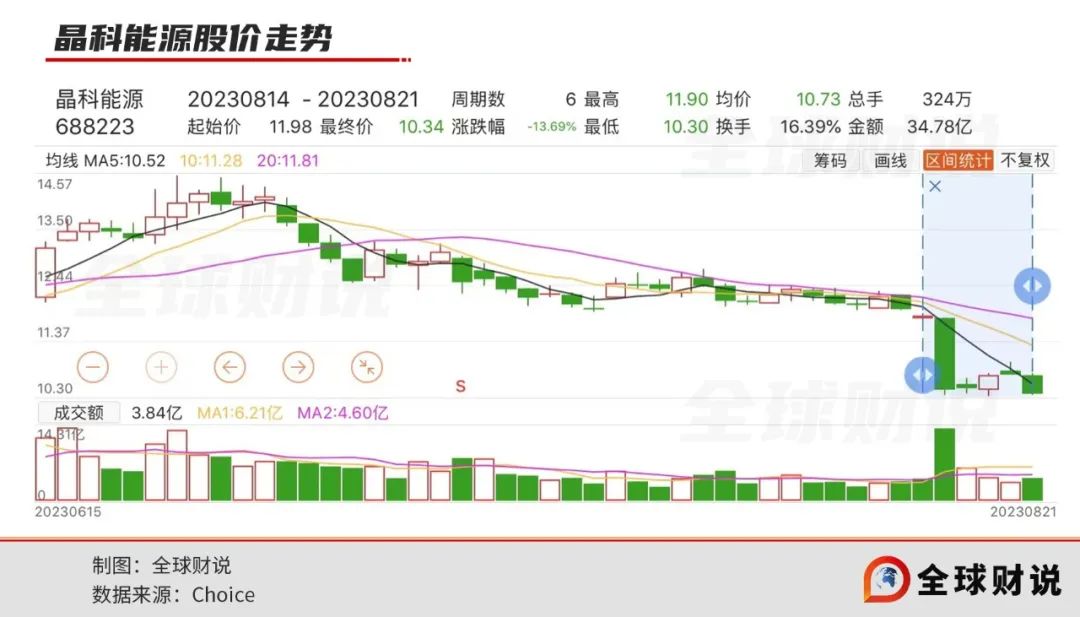 回购计划发布后的几个交易日,晶科能源股价小幅回升,但截至2023年8月21日,晶科能源报收10.34元/股,较财报发布当日股价依旧下跌近14%。