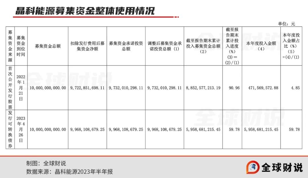 根据2023年半年报中,募集最近使用进展披露情况,截至6月30日,晶科能源累计已使用的IPO募集资金金额为88.53亿元,占募集资金总额90.96%。同时,累计使用可转债募集资金59.59亿元,占募集资金总额59.78%。