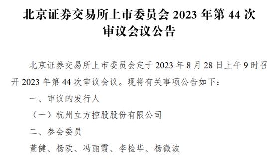 挖贝网 8月21日消息,北交所上市委定于8月28日召开2023年第44次审议会议,立方控股(833030)上会,参会委员为董健、杨欧、冯丽霞、李检华、杨微波。
