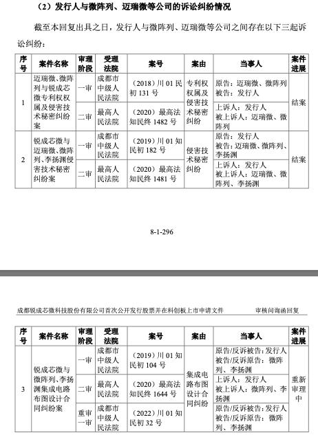 在问询回复的“诉讼”一节中,上交所要求锐成芯微全面梳理与微阵列、迈瑞微等公司的合作历史、诉讼纠纷情况,逐一列示案件受理情况、基本案情、诉讼请求、判决结果及执行情况,诉讼事项对发行人的影响等。