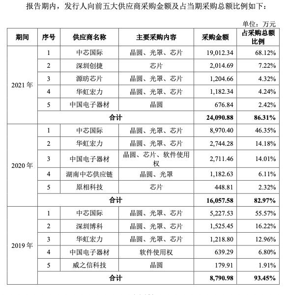 报告期内,锐成芯微向前五大供应商合计采购金额占当期采购总额的比例为93.45%、82.97%、 86.31%。其中,向中芯国际采购金额占当期采购总额的比例为55.57%、46.35%、 68.12%,集中度较高。