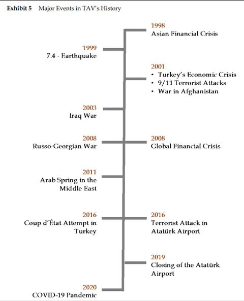 99年,一场大地震袭击了土耳其的东北部(包括伊斯坦布尔),2000年底,土耳其经纪接近崩溃,2001年2月,隔夜利率从50%升到了7500%(!),全国40家银行,破产了1/3。TAV出色的管理层还是在规定期限内,完成了机场的建造。这个机场经历了两次terrorists attack,并总是能很快回到正轨,重新开放(有一次仅用了六小时就完成了修复工作)。