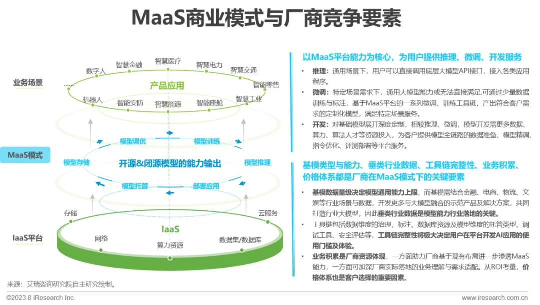 MaaS(Model-as-a-Service),模型即服务,是指以云计算为基础,将大模型作为一项服务提供给用户使用的新业态。如今,MaaS模式已成为各家云巨头厂商发展第一战略优先级,把模型作为重要的生产元素,依托于既有IaaS设施与PaaS平台架构,为下游客户提供以大模型为核心的数据处理、特征工程、模型训练、模型调优、推理部署等服务。未来,顺应大模型开源趋势,MaaS服务商将着力打造大模型商店平台,发力大模型生态建设,纳入更多允许商用的开源模型,提升平台的基模类型及能力,并丰富工具链产品服务,通过业务积累、数据回流、模型迭代逐步形成壁垒,在拉高云服务营收天花板的同时进一步塑造厂商的核心竞争力。