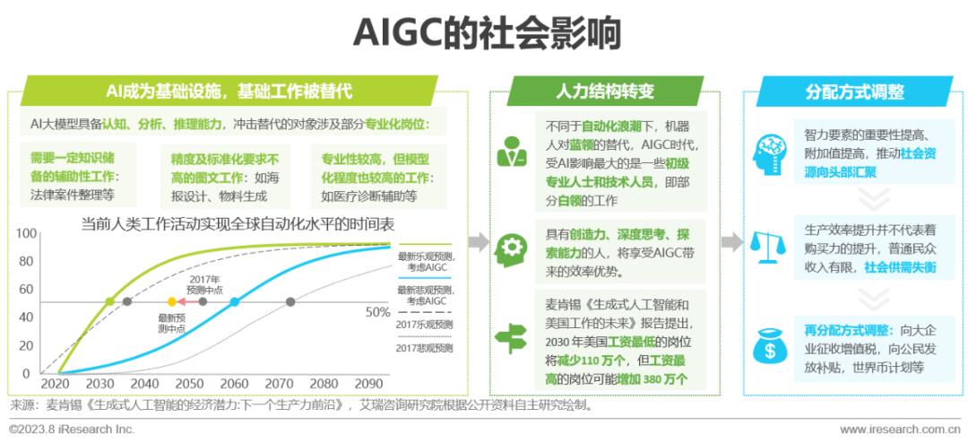 技术的跃迁、生产效率的提升并不会自然带来社会整体福利水平的提升,相反往往以牺牲部分人的利益为前提,进而引发社会结构、分配方式的重塑。AIGC交互界面的用户友好性、大模型开源及API价格的降低、插件服务带来的应用生态繁荣等,都使得AI技术或将成为像水、电、网络一样的基础设施,渗透并改变千行万业。然而,大模型具有认知、分析、推理能力,不同于自动化浪潮下对蓝领的冲击,AIGC时代受AI影响最大的可能是初级专业人士和技术人员,即部分白领。据麦肯锡数据预测,到2045年左右,有50%的工作将被AI替代,比此前的估计加速了10年。与此同时,具有创造力、深度思考等高阶智力的人才,将享受到AIGC带来的效率优势,成为AI的驾驭者,相应的工作需求也会增加。智力要素重要性的提升、附加值的提高,都将推动社会资源和财富向顶尖人才和组织聚集,但社会是一个整体,生产效率的提升并不代表着购买力的提升,被替代的普通职工才是购买力的最大来源,为了维持供需平衡,分配制度需要重塑。如美国总统竞选人杨安泽提出向大企业征收增值税,并向公民发放补贴,以及OpenAI创始人Sam Altman提出的世界币均等分配等,都通过反思并调整现有的分配方式,以驱动社会向更美好的方向演进。