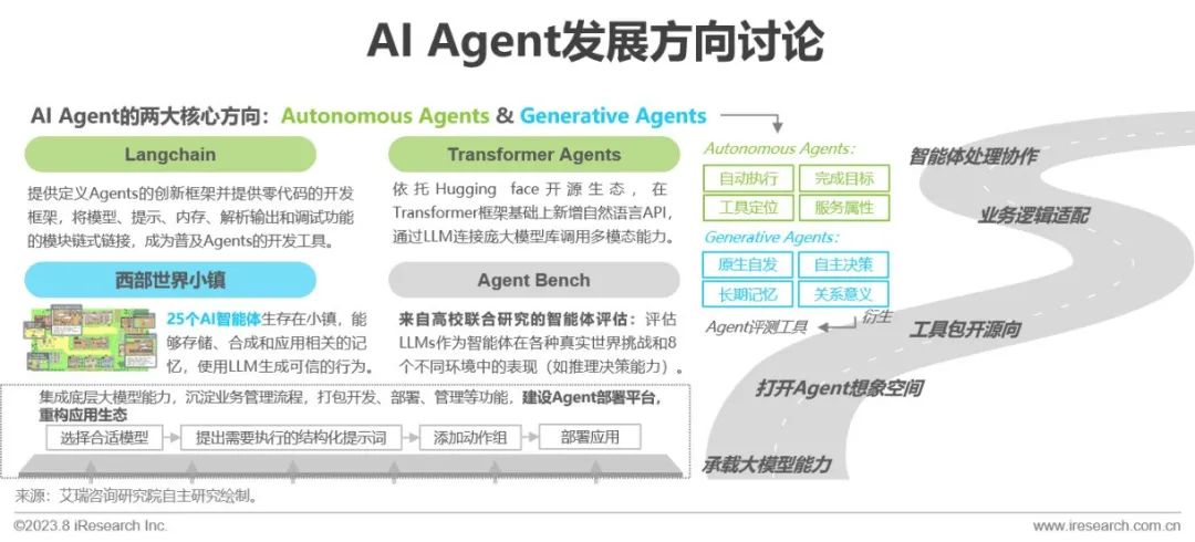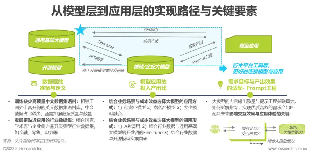 在本轮大模型推动的技术浪潮下,如何连接模型能力与上层应用,完成商业化变现,构建人工智能应用主导的生态系统是AIGC各层厂商重点关注的课题。艾瑞认为,数据准备,ROI衡量与Prompt工程能力是连接模型层与应用层落地的核心三要素。由于AI研究进展缓于国外、中文数据集论文发表难度高、NLP算法改进验证与数据集语言类型关联度低等历史性原因,目前中文NLP数据集语料库在数量与质量方面仍有较大差距。从可行性、性价比与时间角度出发,追赶期间同步发展典型行业应用数据集是弥补中文NLP数据集短板的有效策略;从需求侧角度出发,大模型能力应用化需结合业务场景与成本效益选择大模型的应用方式及调用形式,若基于安全隐私性需求要求私有化部署则投入成本更高,客户端的ROI衡量是决定其能力商业化进程的关键;提示(prompt)是触发AI 模型生成内容的宽泛指令,提示工程则可进一步开发和优化提示,从指令拆解到调用能力多维度融合大模型LLM来处理各类需求,是未来影响影响交互效果与应用体验的关键。