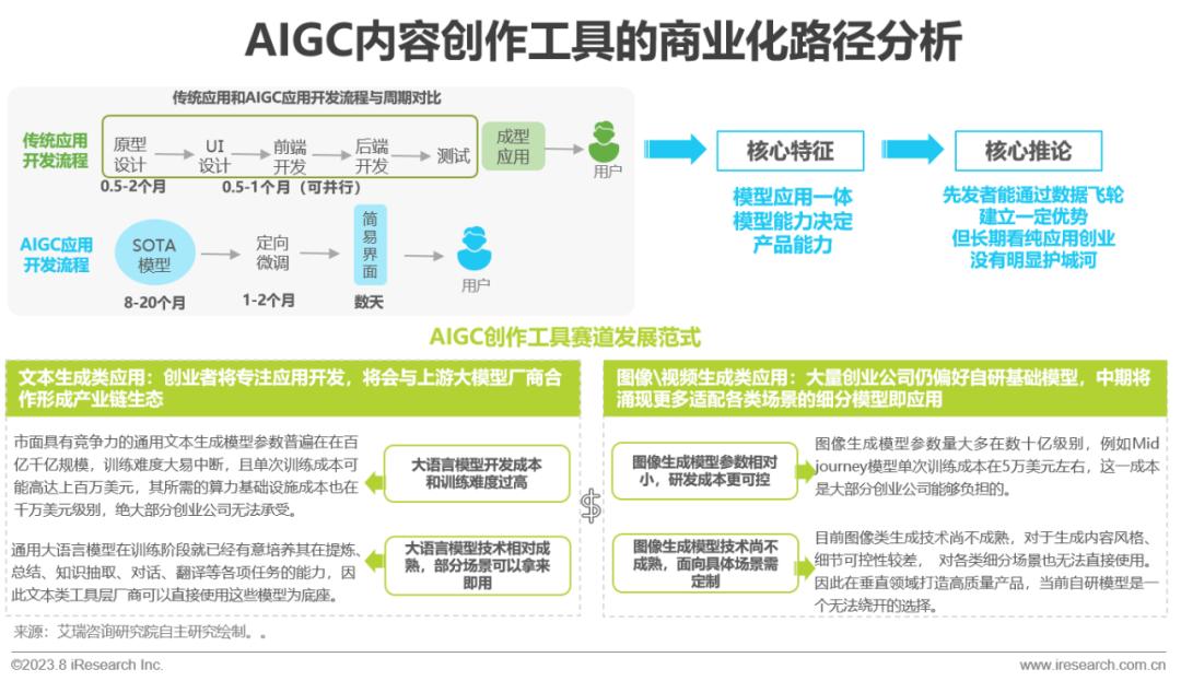 与传统内容创作工具相比,AIGC内容创作工具的最大特点为“底层模型重、前端轻”,因此产品竞争的核心要素也从功能设计变成模型能力。在这种情况下,是否拥有自研SOTA模型将成为AIGC应用厂商的关键分水岭。基于基础大模型的研发投入、使用现有模型开发高质量应用的可行性这两个核心要素来看,文本类应用和图像类应用的发展路径差异明显:大语言模型成熟度高,自研壁垒高,直接基于现有模型开发应用更为现实;而图像生成模型成熟度低,自研成本可控,因此吸引更多创业者聚集。