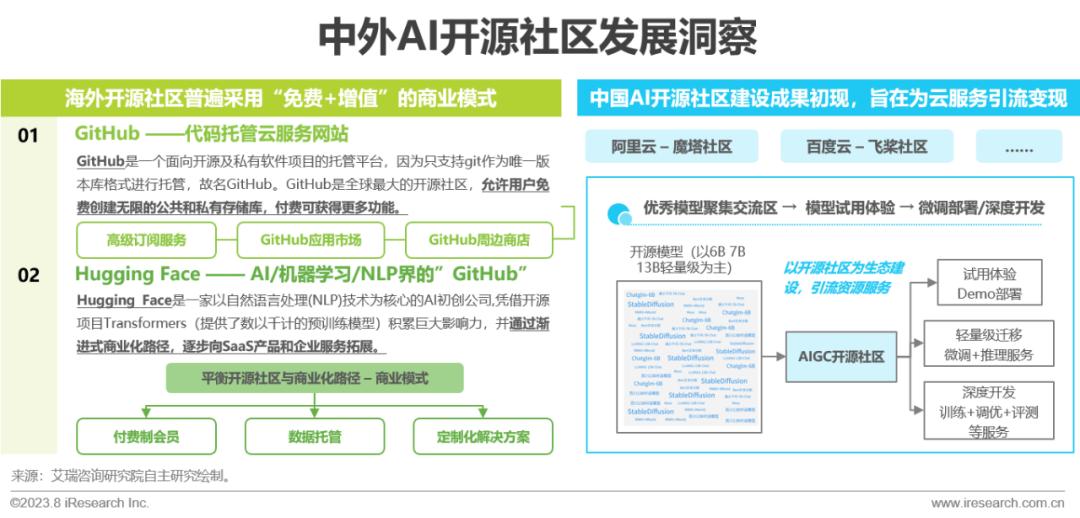 AIGC开源社区的建设可以吸纳更多的开发者及拥有定义用户的主导权,以AI开源创新平台为杠杆,带动支撑底层AI芯片、智算中心及云服务等基础设施发展。从供给侧逻辑来看,大模型开源早期由高校和机构推动,如清华大学的ChatGLM-6B、复旦大学的MOSS,陆续有头部云厂商加入,如百度的文心系列与阿里的通义系列,共同为中国AIGC开源社区的建设“增砖添瓦”,以阿里云魔塔社区、百度云飞桨社区为代表的开源社区建设成果初现,而千亿级模型暂以闭源路径开展,凭借稳定、优质效、完整工具链等产品特点定位应用市场;从商业化路径来看,参考海外明星开源社区Hugging Face的商业模式,中国AI开源社区同样会先免费提供基础算力,为客户提供免费的社区体验、demo部署及测试,并进一步通过付费服务推送轻量级迁移的微调推理服务或深度开发的训练调优平台,提升模型产品性能,通过开源社区吸引开发者、企业客户完成更多部署应用资源的引流变现。