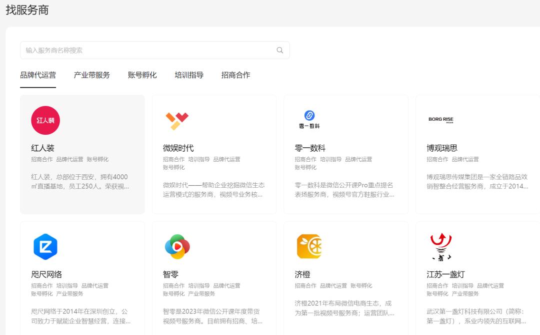 从视频号官网关于服务商的介绍可以看到,目前微信视频号服务商共有品牌代运营、产业带、账号孵化、培训指导和招商合作五个类别,共计347个服务商。