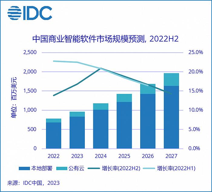 从中国商业智能软件整体市场情况来看,2022年的增速为过去五年来最低水平。不过袁华杰预计,随着企业IT投资逐步恢复,行业有望在下半年至2024年回归正常增速。